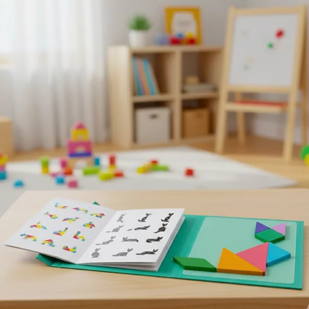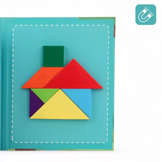 We played with this tangram every night after dinner. My mom joins, and we make cars, rockets, or birds. The magnets stick really well and don’t fall.