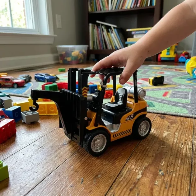 Our living room gets loud when the forklift comes out! My friends and I take turns loading small cars on it. It never gets boring.