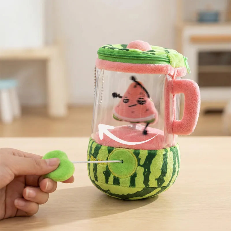 My niece is shy, but this tiny juicer plush helps her open up. She lets friends tug the string, then they all start laughing and playing together.