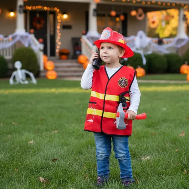 We got this firefighter set for Halloween and our son was thrilled. No fuss putting on the vest and it didn’t itch at all.
