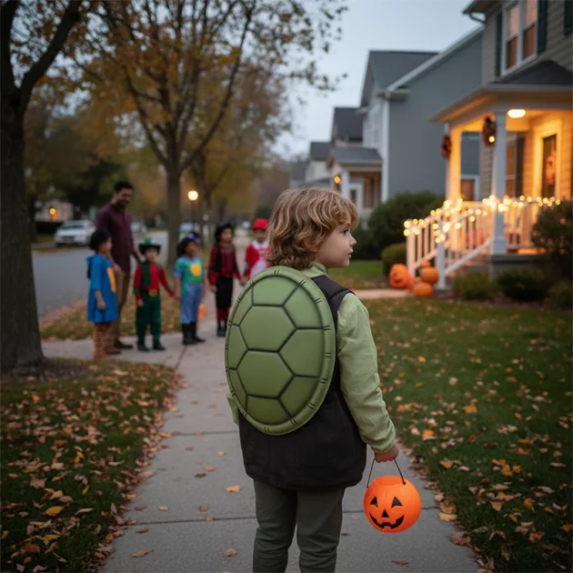 My kiddo looked adorable trick-or-treating in his turtle shell. It stayed on all night, and he didn’t complain once!