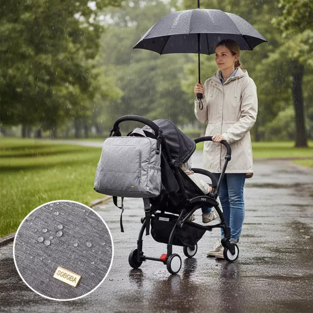 Can’t believe how roomy it is! Fits diapers, wipes, clothes, and my phone too. Rainy days don’t worry me now.